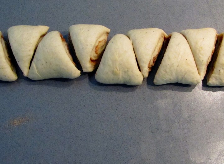…ja painat pullan päältä molempien käsien etusormilla rystyspuolet alaspäin ja aivan leivinpöytään asti, muodostuu taikinakolmiosta korvapuusti. Tämä ei enää leviä mihinkään, vaan korvapuusto säilyttää muotonsa. Pullat kohotetaan vielä ennen paistamista.
