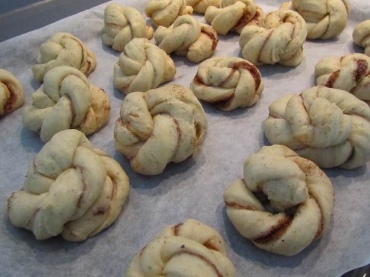 Kierittele taikinanauhaa itsensä ympärille niin, että nauha menee kierteelle. Kiepauta kierteinen nauha sykerölle, taita nauhan pää sykerön alle ja nosta leivinpaperilla peitetylle uunipellille kohoamaan. Peittele leivonnaiset leivinliinalla.