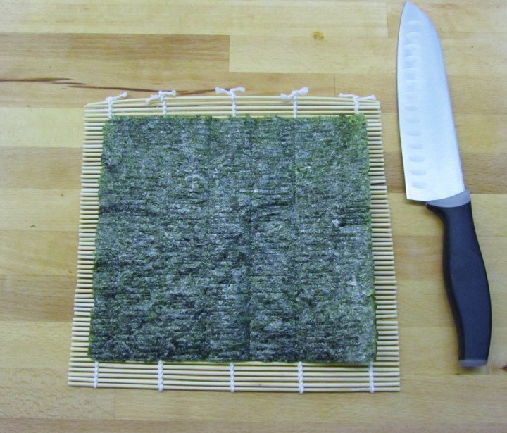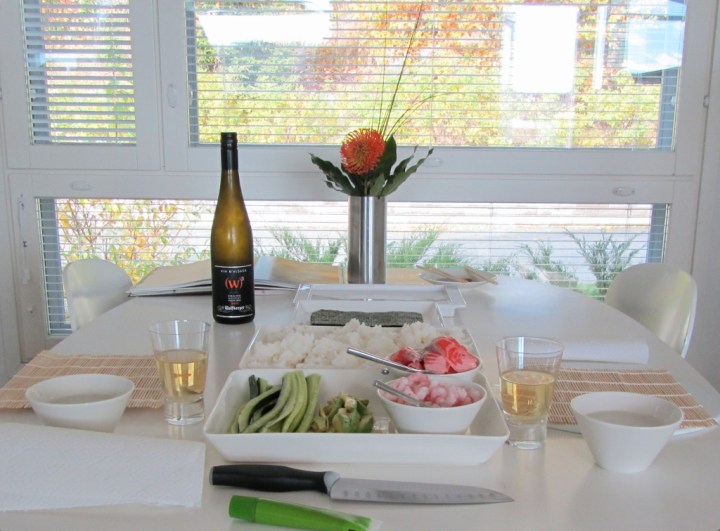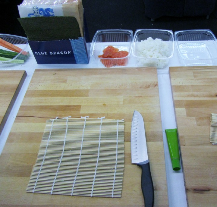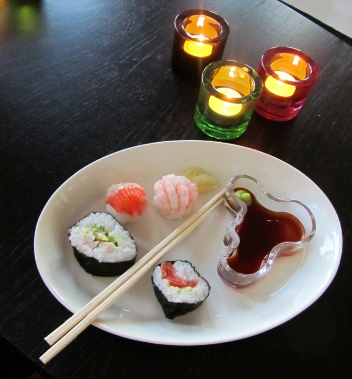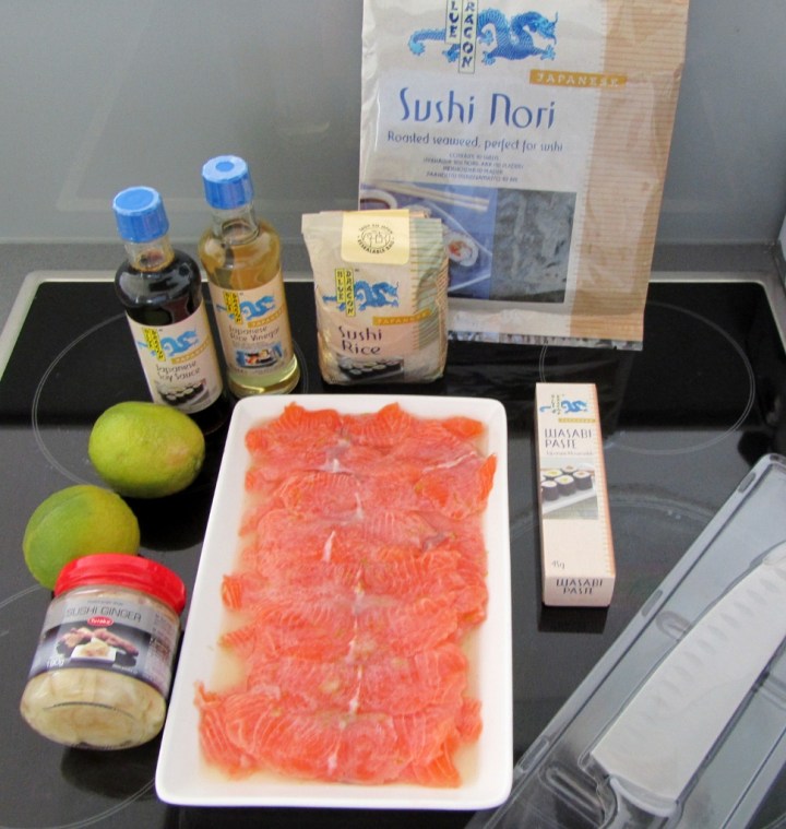 Sushipajamme toimi keittiön pöydän ympärillä. Marinoidun lohen lisäksi meillä oli edellä mainitsemiani katkarapuja ja kasviksia. Wasabin, norilevän ja veitsen hankin sushikoulusta. Makisut meillä sattui olemaan Rouvan kesäprojektin peruina. Hankin ne kuvausrekvisiitaksi, mutta pääsivät käyttöön nyt.