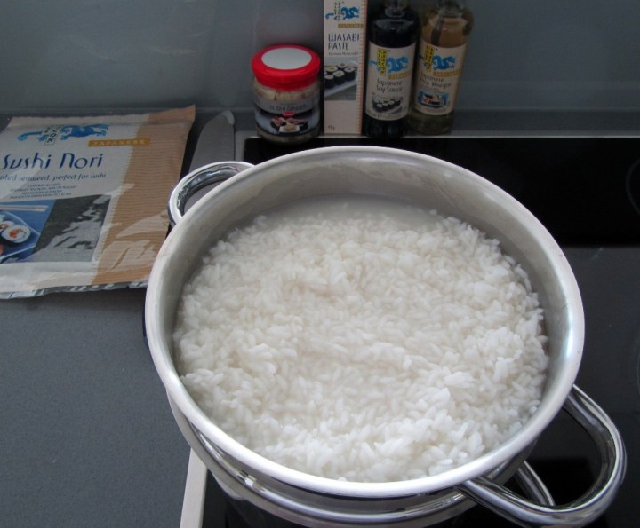 Pesin riisiä opettajan ohjeita noudattaen useaan kertaan. Kokeilin riisin kypsentämistä vesihauteessa ja sepä oli kätevää. Jäljittelin siis riisinkeitintä. Olisi pitänyt muutamaan kertaan enemmän sekoittaa riisiä, sillä pohjaosassa oleilleet jyväset menivät inasen muhjuksi. Ensi kerralla osaan varoa. Riisiä oli 500 g ja vettä 8 dl, kypsennysaikaa en muistanut vahtia. Kypsän riisin maustoin noin desilitralla riisiviinietikkaa ja muutamalla ruokalusikallisella sokeria. Laitoin myös ripauksen suolaa joukkoon.