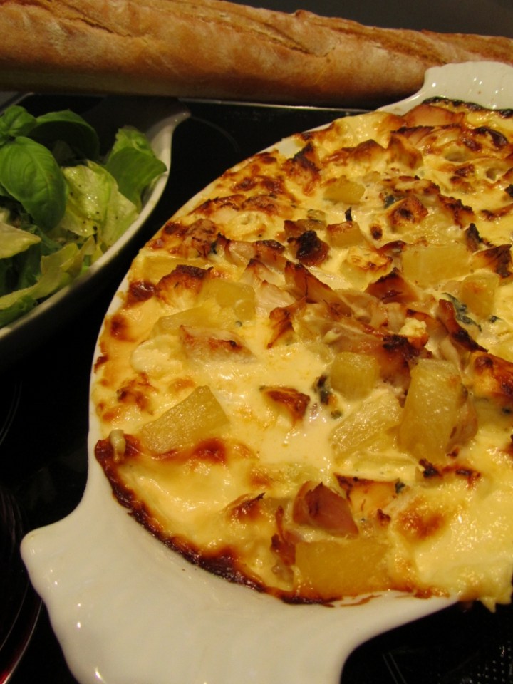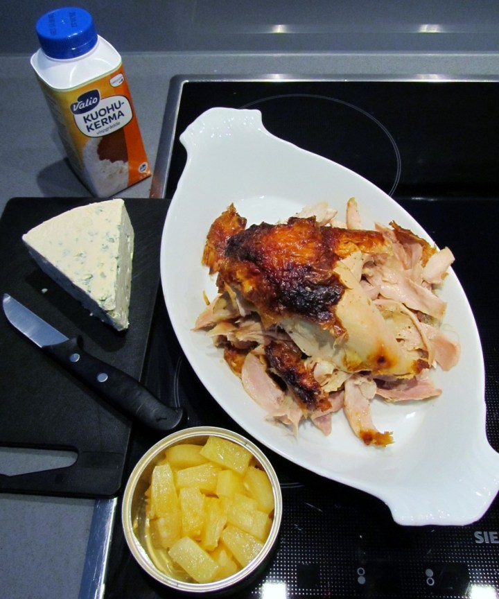 Palastele luuttomaksi käsitelty broileri. Kuutioi juusto. Lado kaikki palaset laakeaan uunivuokaan. Kaada päälle kermaa niin paljon, että ainekset melkein peittyvät. Nosta vuoka 200 C uuniin ja kypsennä kunnes juusto on sulanut ja kerman pinta ruskistunut.