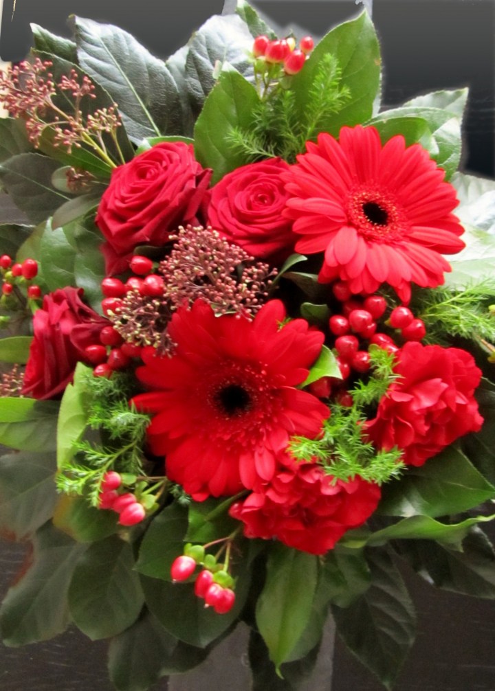 Mutta onneksi on olemassa esimerkiksi kukkia, hyvää ruokaa ja viiniä. Aloitetaanpa kukista: tämän uhkean kukkakimpun sitoi mielestäni Suomen parhaan kukkakaupan eli Kukkakauppa Katariinan taitava Jaana-kauppias. Huikea! Se on saanut luvan toimia keinoaurinkona meidän olohuoneen pöydällämme.