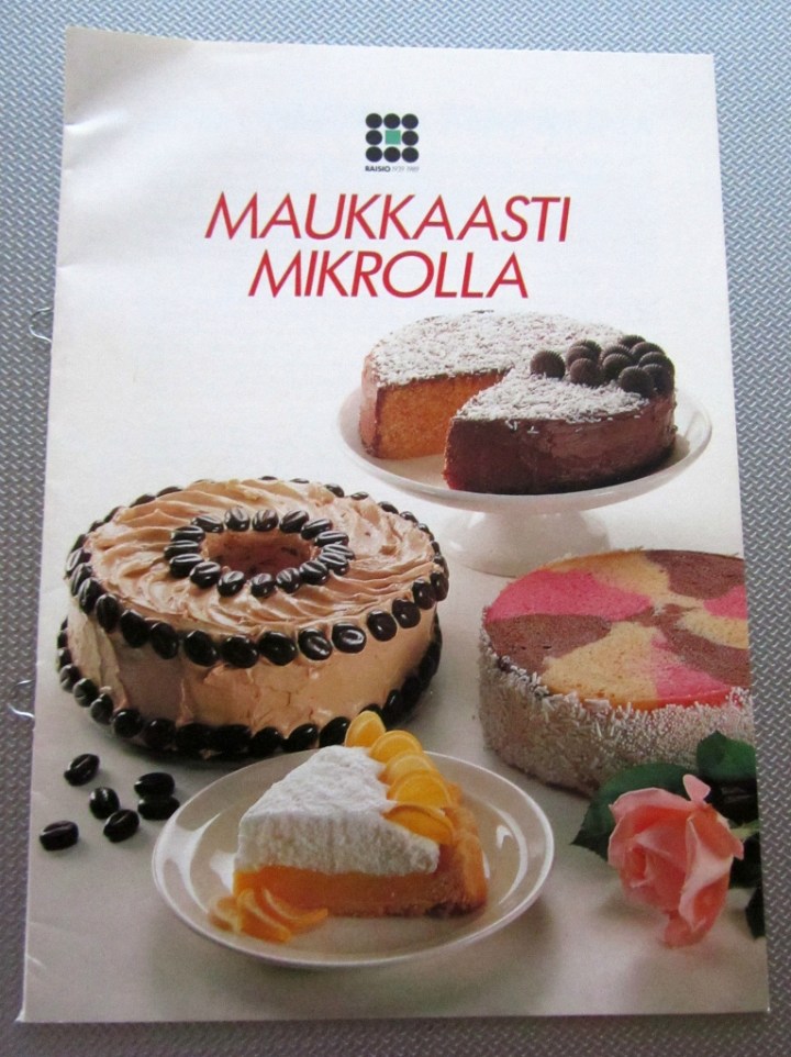 Niin vaan sain aikaiseksi 16-sivuisen mikroaaltoruokaesitteen tuolloiselle työnantajalleni, Raisio Yhtymälle. Kansikuvan leivonnaisia on pinnoitettu ahkerasti ja oikean laidan kakun idean bongasin jostakin jenkkilehdestä. Kakkutaikinaa on paitsi maustettu mansikalla ja kaakaolla, myös värjätty karamellivärillä. Waude, mikä idea…