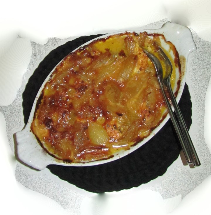 Maksapasteijan lisäkkeeksi valmistin kuvan ruokaa, joka ei ole lainkaan niin rasvaista, kuin miltä se näyttää. Kyseessä on ”vanha rakkaus” eli Mysi Lahtisen ”Talvinen sipuliherkku”. Ruokalaji, joka sopii lisäkkeeksi esimerkiksi maksapihveille, mutta menee ihan pääruoastakin. Valitettavasti meillä oli melko isokokoisia sipuleita, enkä saanut niitä säilymään ehjinä. Talvinen sipuliherkku on nimittäin myös hyvin kaunis ruoka pikkusipuleista valmistettuna.