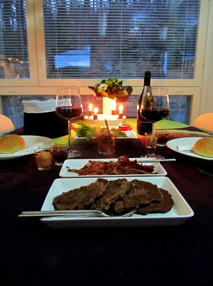 tuon ohjeen mukaan. Lisukkeet sitten tavalliseen tyyliini 🙂 (ei noin hienostunutta kuin teillä), ja juomanakin meni synttärijuhlilta jäänyttä kokista.