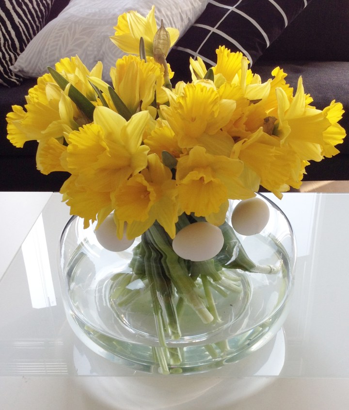 Ja heti toisena pääsiäispäivänä siivosimme kaiken juhlatilpehöörin pois. Ainoaksi keltaiseen viittavaksi sisutuselementiksi jäi orvokki-istutus, jonka hankin meille Kauppilan puutarhasta. Orvokit löytänevät tiensä etupihalle jahka lämpötilat nousevat. Yhden satsin nimittäin taisin jo tapattaa lumisateeseen.