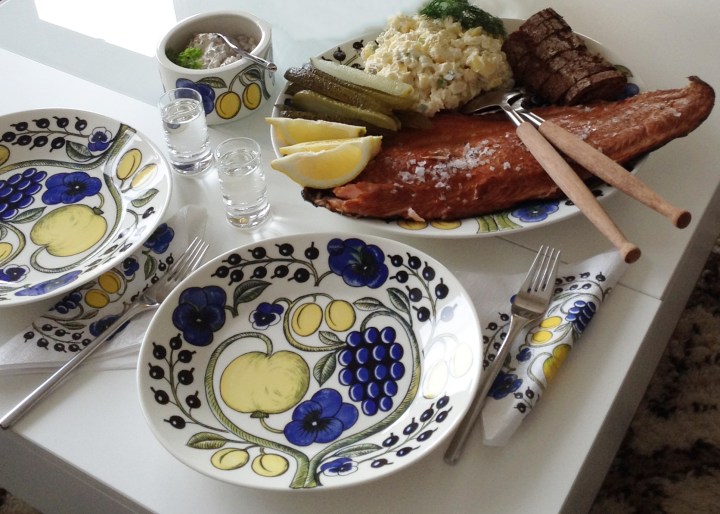 Ruokailutkin sujuivat olohuoneen pöydän ääressä, kun ei ollut sellaista pyhäpäivän tuntua että olisi viitsinyt kattaa kunnolla. Tämä zakuska-tyyppinen ateria taisi olla parasta pääsiäisessä: savustimme lohifileen, tein älyhyvää perunasalaattia ja loput eväät ostimme valmiina eli sienisalaatin, venäläiset suolakurkut ja hapanleivän. Nam.