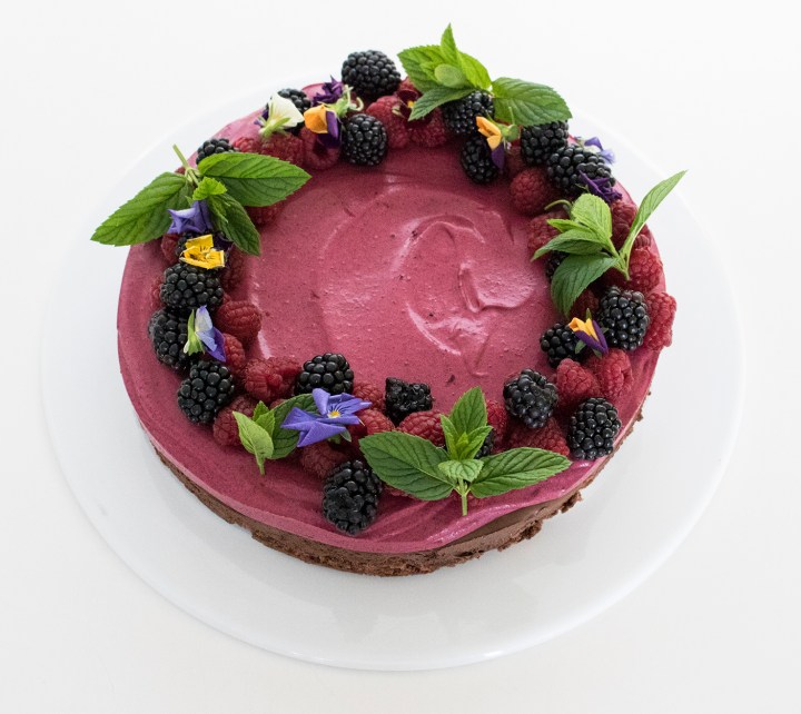 Juuri ennen tarjoilua irrota vuoka ja nosta kakku tarjoiluastiaan. Viimeistele kakku vadelmilla, mustikoilla, syötävillä kukilla ja sitruunamelissalla.