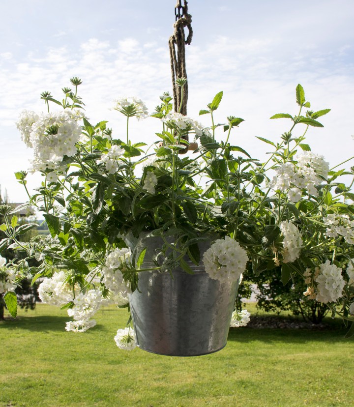 Amppelikin on nostettu paikalleen. Miksi muuten amppelien muoviruukut ovat niin kamalan rumia? Laitoin oman kukkani tuollaiseen sinkkiämpäriin, kun inhottivat ne muovipurkin oranssit henkeselit.