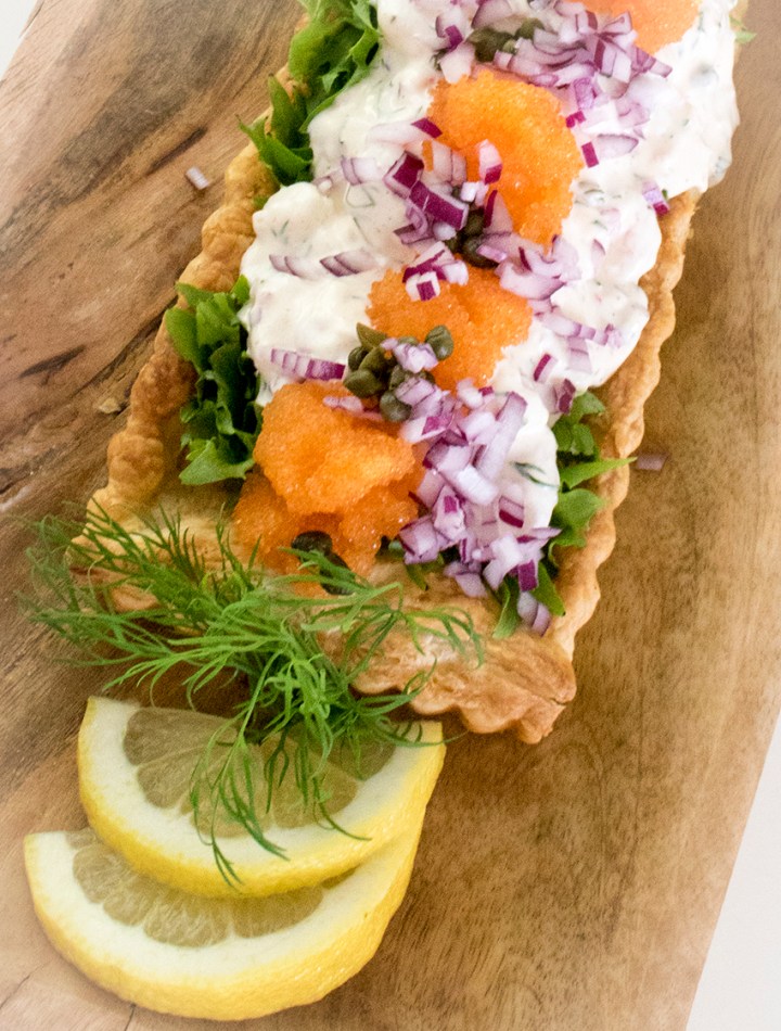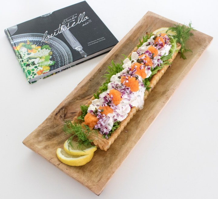 Tarjo Skagen-salaattipiirakkaa viileän, kuivan valkoviinin kera.