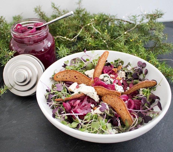 Huuhtele ja kuivaa salaattisekoitus, levitä salaattimaljaan. Kuutioi sinihomejuusto. Ripota salaattikerrokselle juustokuutioita ja ruislastuja. Nostele lopuksi glögimarinoidut punasipulit salaatille. Käytä marinadilientä salaattikastikkeena.