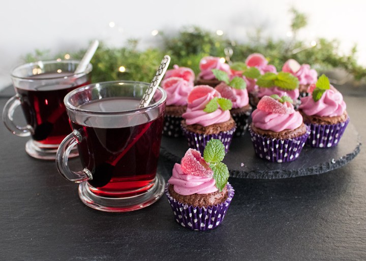 Valmista glögikuorrute: vatkaa tasaiseksi seokseksi tomusokeri, glögitiiviste, mustaherukkasose, voi ja tuorejuusto. Levitä tai pursota kuorrutetta kuppikakuille ja koristele ne haluamallasi tavalla.