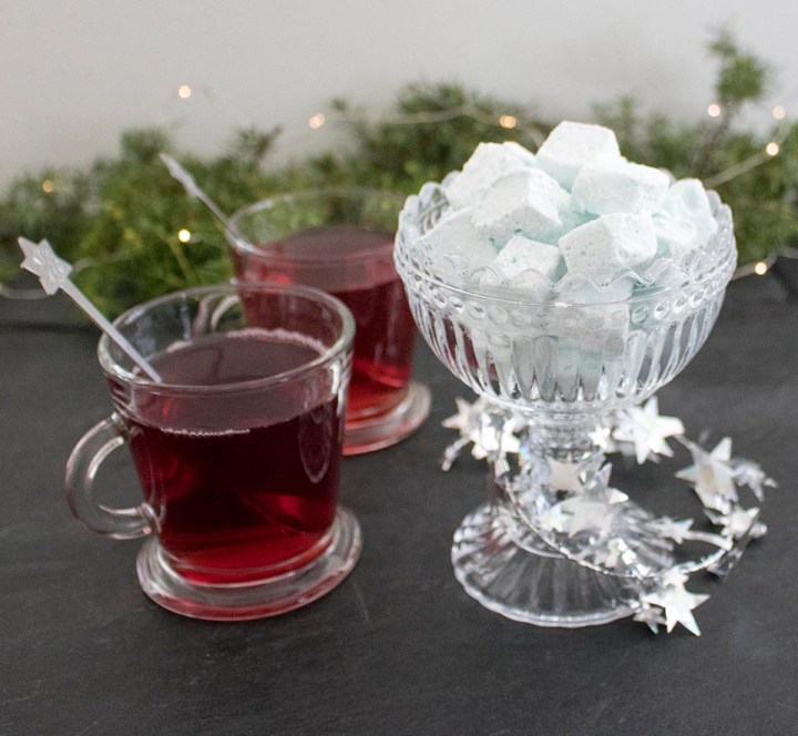 Laita liivatelehdet pehmenemään kylmään veteen. Mittaa 1 dl glögijuomaa pieneen kasariin. Kuumenna seos kiehuvaksi ja lisää liivatelehdet. Lisää liivateliemeen elintarvikeväriä. Ole varovainen elintarvikeväriä käyttäessäsi: lisää väriä lusikalla vähän kerrassaan, ei suoraan väriainepullosta. Lisää väriä kunnes vaahtokarkkimassa on mieleistäsi. Voit käyttää muutakin väriä kuin sinistä tai jättää väriaineen kokonaan pois.