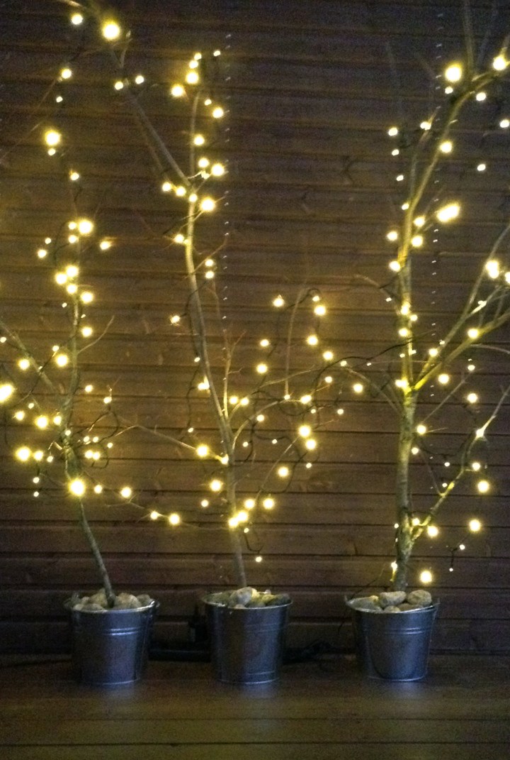 Herra Raadelmasta teki meille näin hienot valopuut täksi talveksi! Ne ovat siis alunperin pihamme pilvikirsikasta karsittuja oksia, jotka on istutettu pieniin sinkkiämpäreihin kivituhkan ja seulanpääkivien avulla. Joulukuusta emme tänä(kään) vuonna hankkineet, sillä jouluviikon koittaessa olimme jo viettäneet joulua parisen kuukautta Rouvan R:n töiden vuoksi. Ja ovathan nämä ympäristömyötäiset ”kuuset” siinäkin mielessä käteviä, etteivät ne varista neulasia!