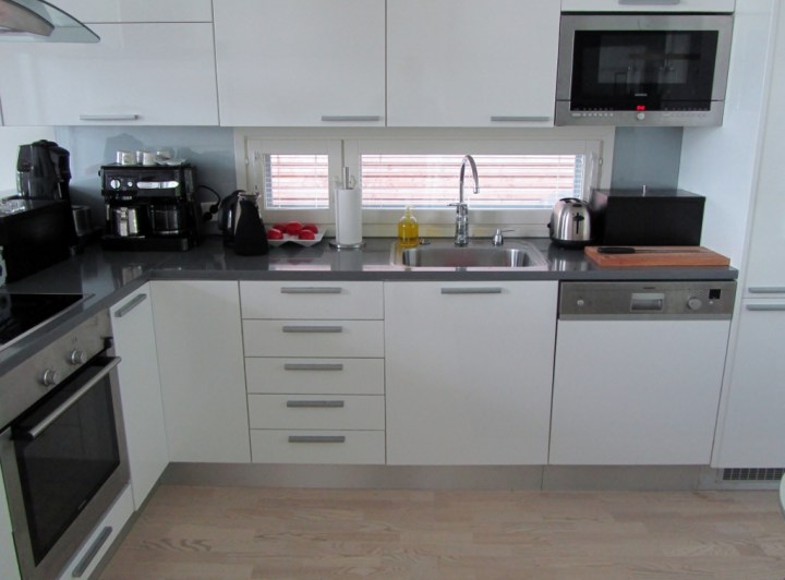 Myös valkoiset keittiön kaapistot löytyvät likimain puolesta Suomen kodeista. Ihan hyvä valinta, ei pääse kyllästymään.