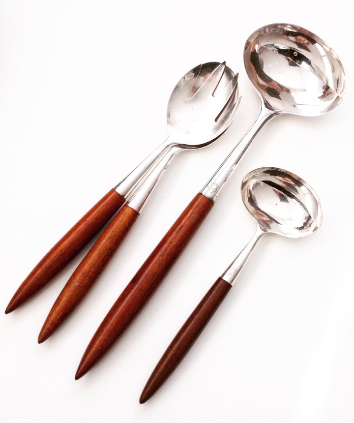 Jäin miettimään omaa sisustustyyliäni ja oikeastaan sitä ilmentää hyvin tämä kuva: sain Amerikan-tätini kuolinpesästä perintönä kasan ruokailuhopeaa. Tavarat ovat 1950-luvulta ja aikas kamalia, mutta nämä ottimet yllättivät iloisesti. Kyselin Instagramista vinkkiä niiden alkuperästä ja ahkeralla googlaamisella ratkaisu löytyi. Ottimet ovat Auran Kultaseppien tuotantoa juuri 1950-60-luvuilta. Näihin kiteytyy oma makumieltymykseni eli hillitty mutta ei askeettinen muotokieli. En ehkä osaisi asua Artek-tyylisessä ympäristössä, mutta kylläkin jonkinlaisen tanskalaisen designin keskellä. Ennemmin Svenskt Tennin kodikasta lämpöä kuin kliinistä, tyylipuhdasta ankaruutta.