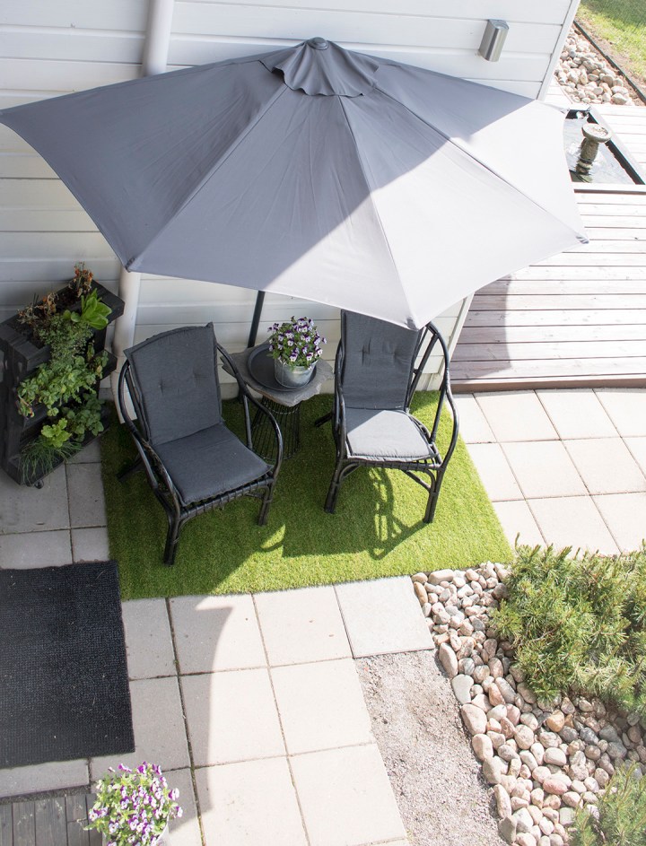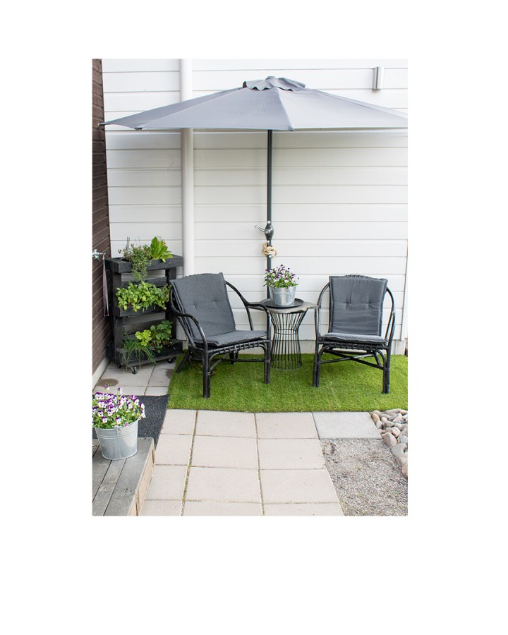 Seuraavaksi ideoitiin tilan kalustusta. Päivänvarjomme, joka näkyy tuolla taustalla, rikkoutui viime kesänä kovassa tuulessa eikä siihen saanut uutta varjokangasta. Selailimme kaikki mahdolliset kesäkalustemyymälöiden katalogit kunnes löytyi sopiva uusi varjo: Jyskin puolikas päivänvarjo. Se sattui vielä olemaan tarjouksessa, joten varjokaupasta selvittiin 40 eurolla.