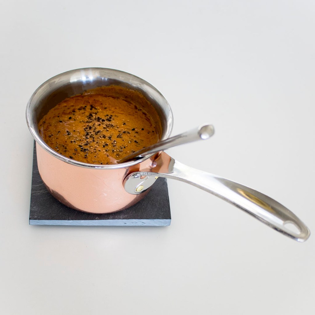 Laita kasariin voi, Dijonin sinappi ja tomaattipyree. Kuumenna seosta, kunnes se ruskistuu kevyesti. Lisää sokeri, suola ja paahdettu mustapippurirouhe, sekoita tasaiseksi ja lisää noin puolet kermasta. Kiehauta kastikkeen pohja ja jätä se poreilemaan miedolle lämmölle. Lisää kermaa pikkuhiljaa.