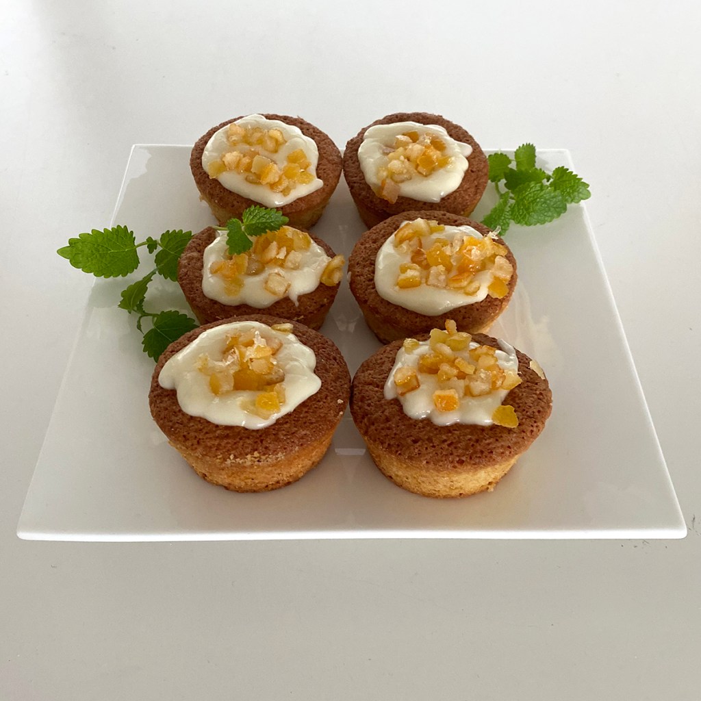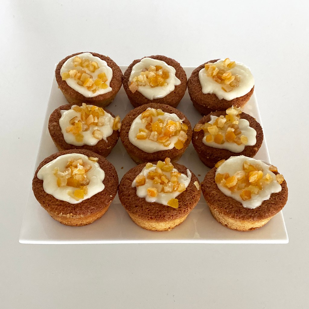 Kostuta jäähtyneet leivokset appelsiinimehulla. Valmista kuorrutus sekoittamalla tomusokeri ja valitsemasi neste sileäksi tahnaksi. Levitä leivoksille ja viimeistele appelsiinin kuoriraasteella tai –paloilla.
