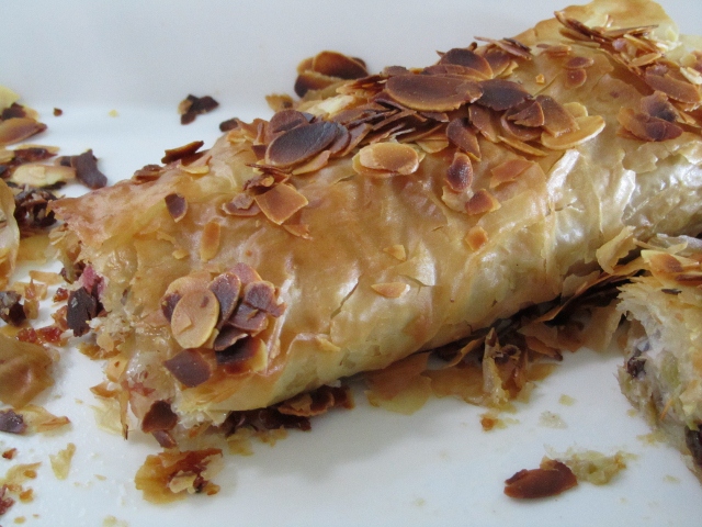 Filo-taikinan käsitteleminen: Sulata voi. Levitä uunipellin päällä olevalle leivinpaperille filoarkki ja voitele filoarkki kevyesti voisulalla. Asettele arkki toisensa päälle myös voideltuina. Laita niiden päälle viimeinen, voitelematon arkki. Lusikoi täyte arkin päälle. Taita arkkikasan vasen ja oikea reuna täytteen päälle ja rullaa paksuksi kääröksi.