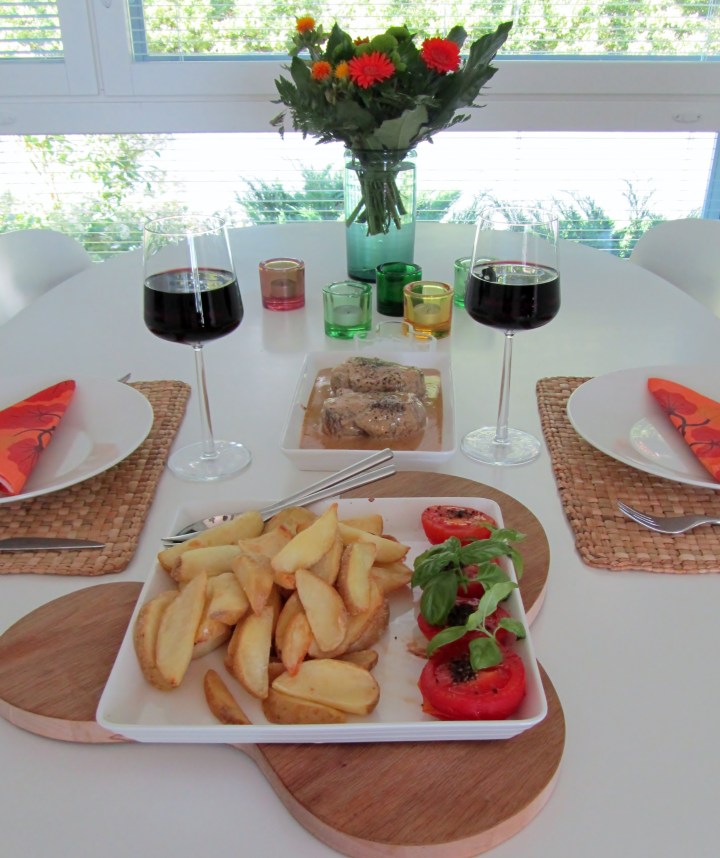 Viikonloppu käynnistyy tästä: pippuripihvit kermakastikkeessa, lohkoperunat ja uunitomaatit. Laseissa Kumalaa.